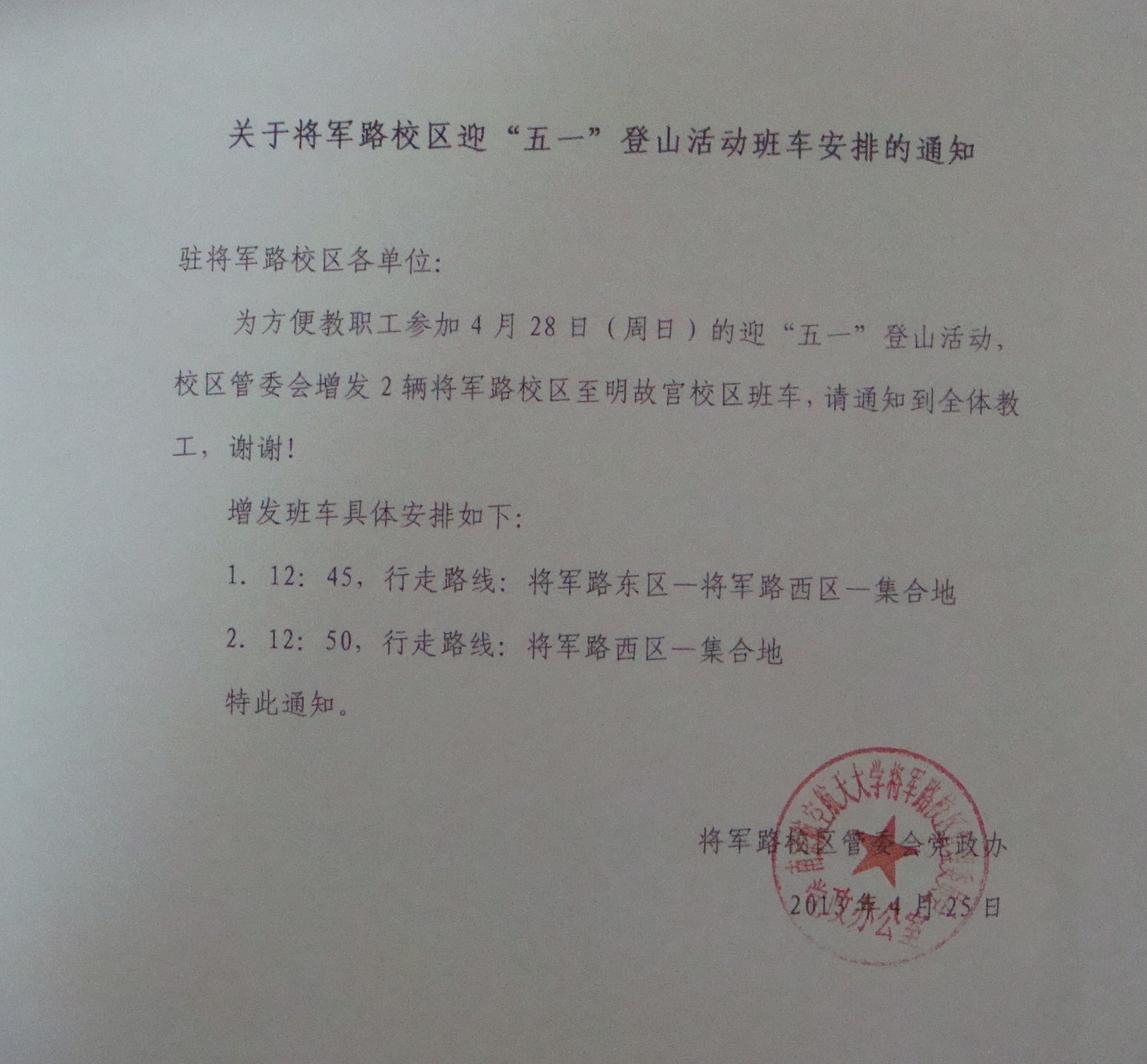 “迎五一”登山活动将军路校区直达集合地班车通知