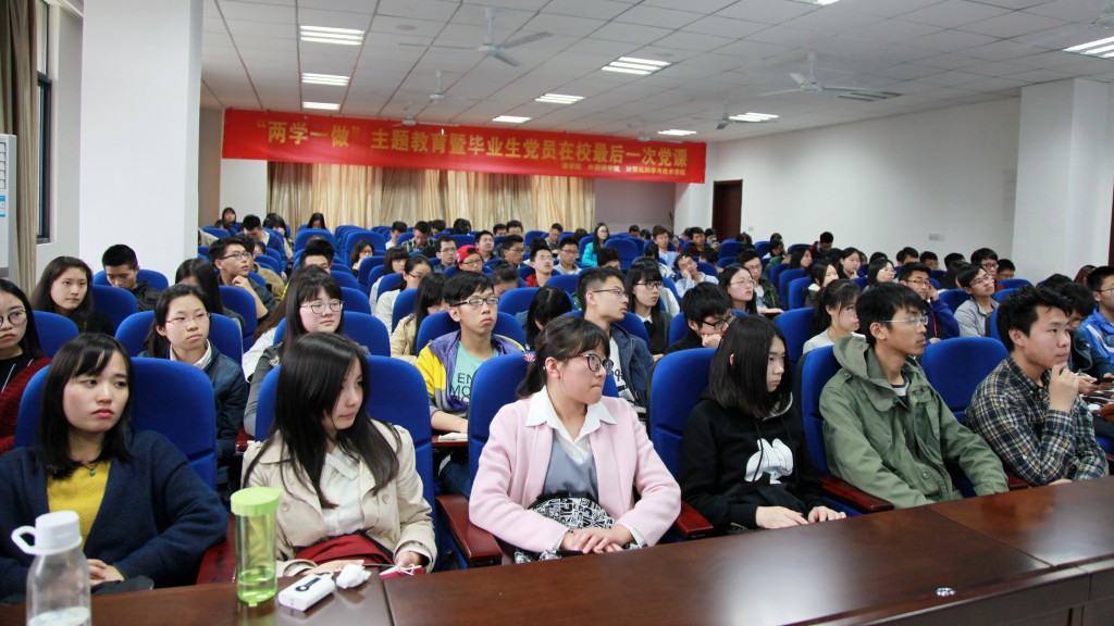 与理学院、计算机科学与技术学院联合开展的“两学一做”主题教育暨毕业生党员在校最后一次党课活动在将军路校区开展。本次活动主题为“凝聚在党旗下,与祖国共奋进”,邀请到校关工委常务副主任丁荣茂担任主讲人,来自三个学院的150余名学生党员参加了教育活动。