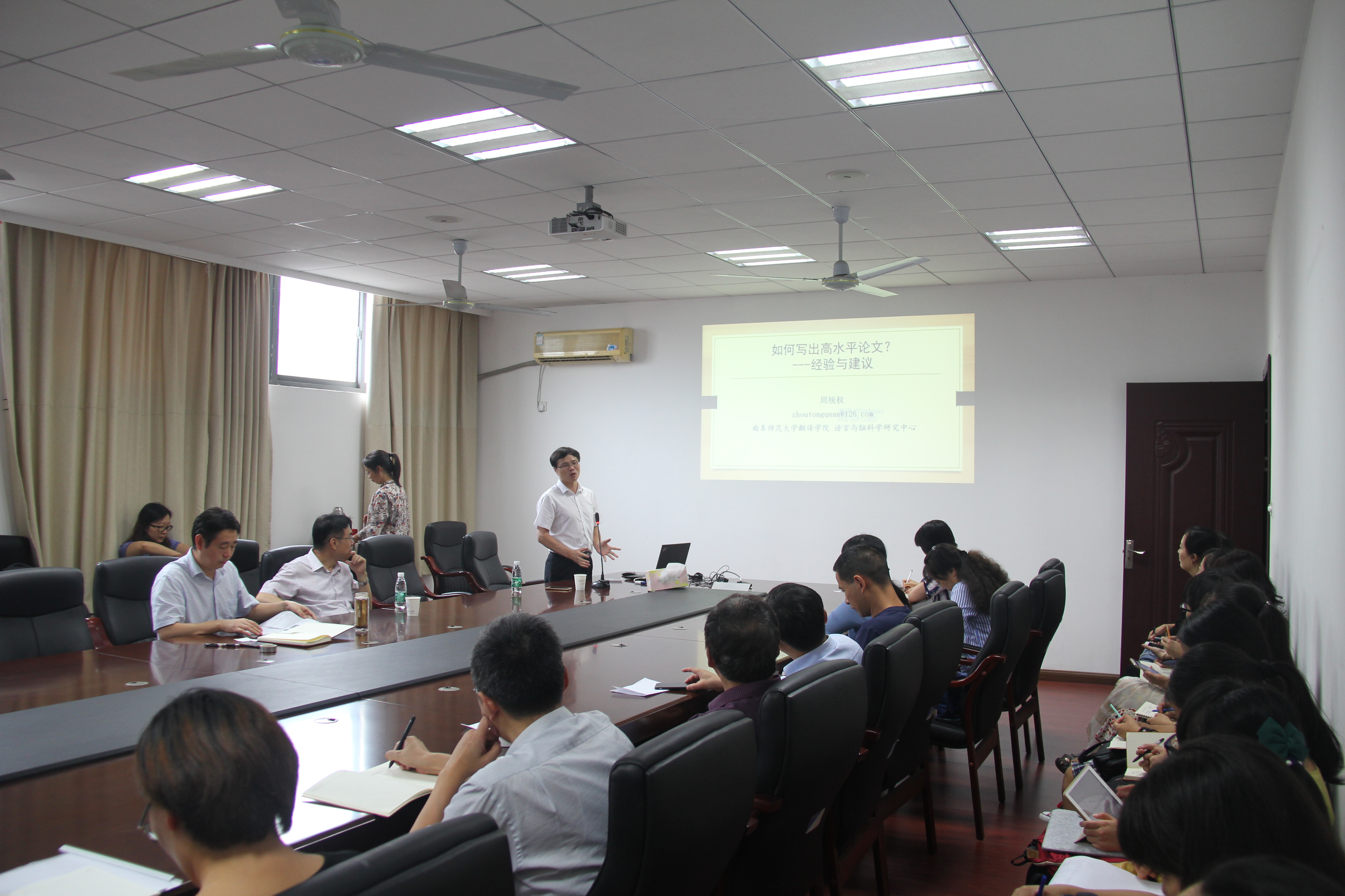 9月20日,曲阜师范大学翻译学院博士生导师周统权教授应邀在成人漫画 做了题为“从学术论文写作到科研项目申报”的精彩学术报告。成人漫画 副院长徐以中教授主持报告会。学院40余位教师聆听了报告。