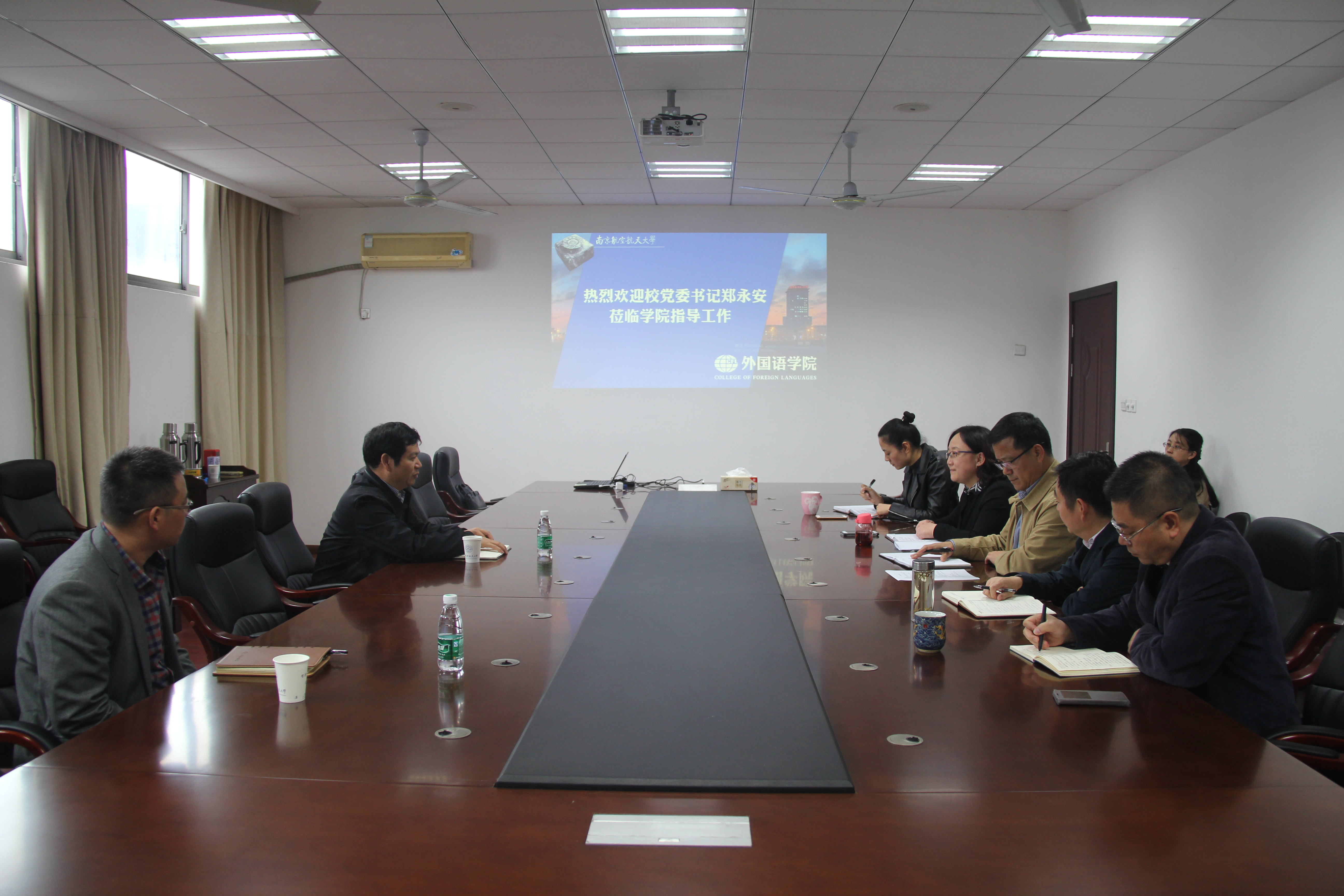 调研会上,郑永安书记认真听取了学院工作汇报。院长范祥涛结合学院“十三五”规划详细阐述了外语学科的定位,认为学院应以一流的语言教学服务于学校国际化人才培养和“双一流”建设,努力在服务行业和国家战略方面形成一定的社会影响力,要把公共外语教学作为国际化人才培养工作的重心,服务学校各个学科发展,同时要利用学院自身优势在学校国际化氛围营造工作中积极作为。围绕课程教学、教学改革、课程建设、学术研究等方面,范祥涛汇报了当前外语学科建设的具体任务。他还就如何依托学校“三航”特色在教学模式、课程体系、第二课堂、学科服务、科研成果、行业服务等方面特色发展介绍了学院的具体发展思路及已经启动推进的相关工作,并分析了学院在师资队伍建设、教师职称晋升、学科建设等方面面临的困难和问题。其他班子成员结合各自分管工作从班子建设、党建工作、专业建设、教学改革、学术研究和学风建设等方面进行了汇报。