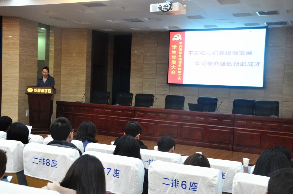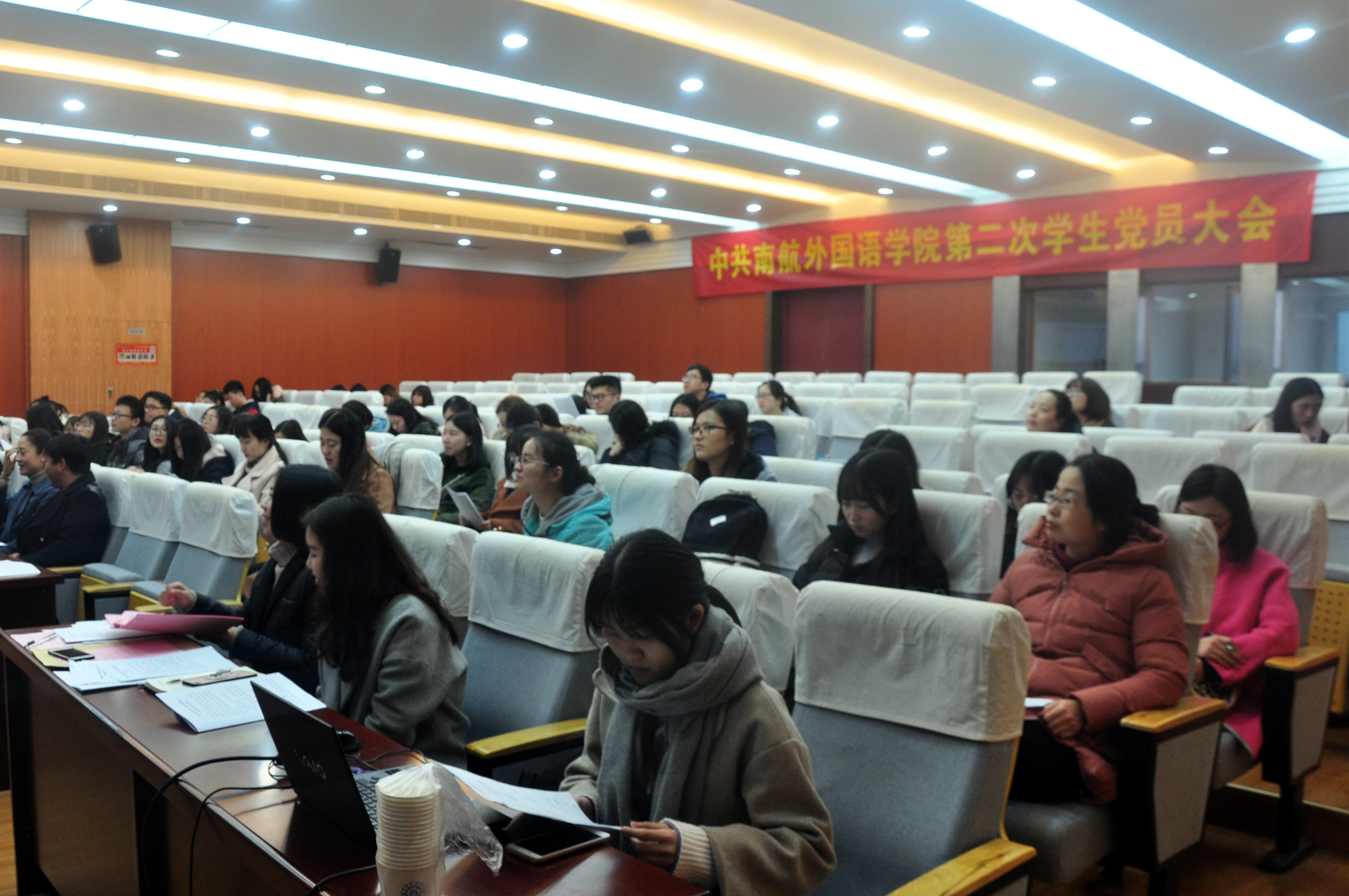 2017年12月22日中午,成人漫画 学生党总支第二次党员大会在将军路校区召开。校党委组织部正科级组织员王宁,院党委书记刘健荣、党委副书记梁薇,英语系、日语系负责人,各年级辅导员和全体学生党员参加了会议。大会由院团委书记杨一主持。