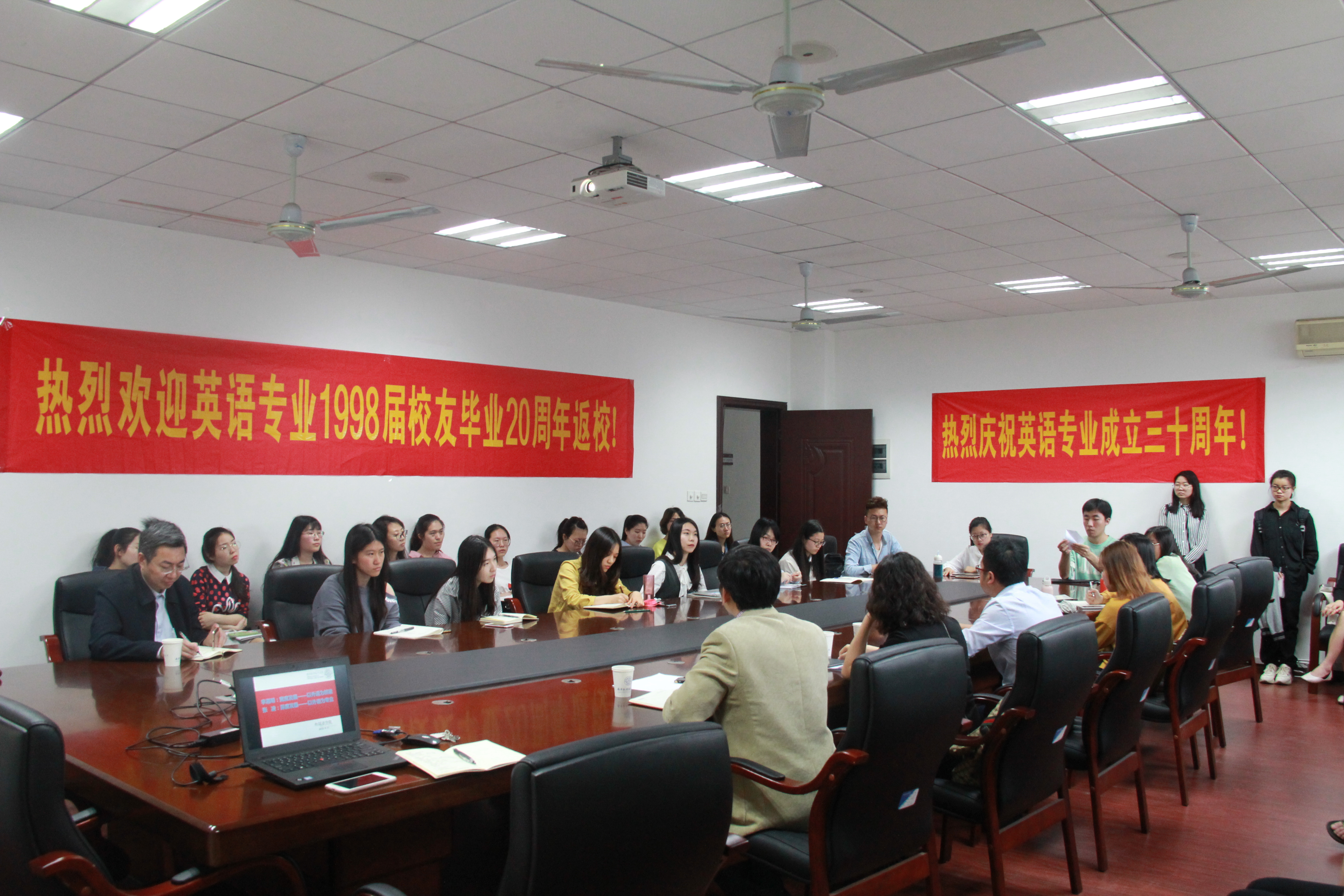 4月21日,成人漫画 于院楼322会议室举行了主题为民航英语伴你飞的“凤回巢”校友职场说分享会。英语系主任姜礼福老师主持了此次分享会,参加会议的还有英语系王孝存老师和二十余位成人漫画 本科生、研究生。