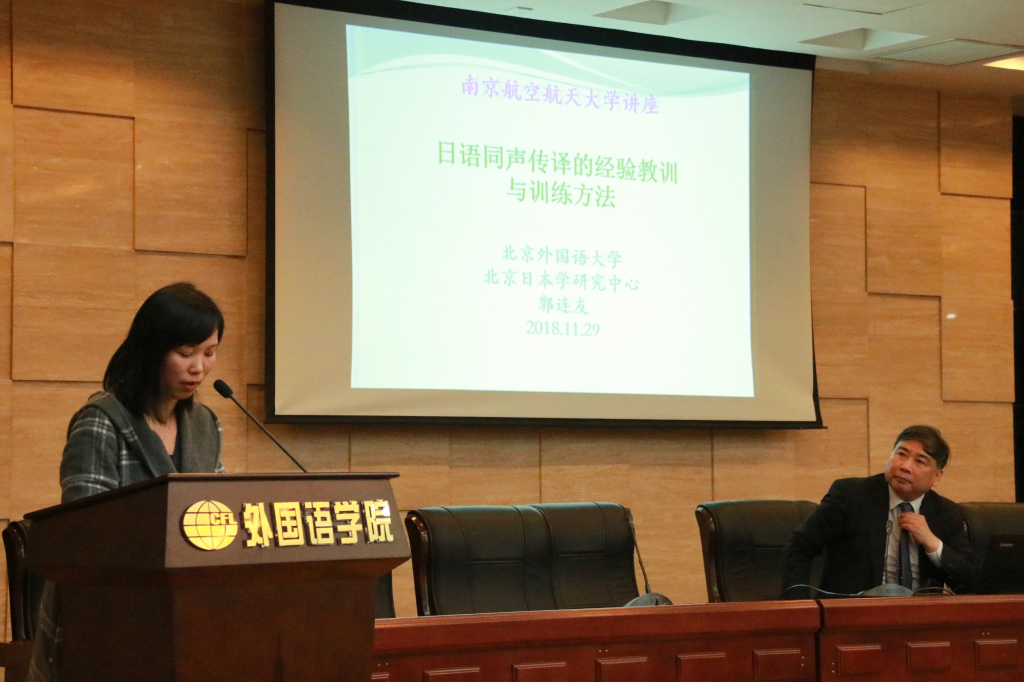 11月29日(周四)19时许,北京外国语大学日本学研究中心主任、博士生导师、中国日语教学研究会副会长郭连友教授在成人漫画 国际会议中心举办了题为“日语同声传译的经验教训与训练方法”的学术讲座。成人漫画 日语系周菲菲老师主持了本次讲座,学院徐以中副院长、日语系师生及部分英语专业师生聆听了此次讲座。
