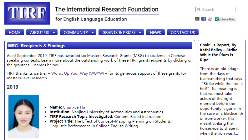 2019年9月,国际英语教育研究基金会(TIRF)发布了2019-2020年中国区硕士论文项目资助名单,我校成人漫画 2017级研究生胡春雪的硕士论文“The Effect of Concept-Mapping Planning on Students’ Linguistic Performance in College English Writing”成功获得立项资助,指导教师为刘长江教授。