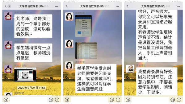 大学英语50位任课教师中,男教师16人,女教师34人,大于等于50岁的教师7人,无一例外,立即停止休假,废寝忘食地投入到“主播”事业的准备中。对标线下课堂,学院和教学部组织教师积极讨论,一致认可四管齐下,两手准备,自由组合提高线上教学质量的方式:一是课程组统筹共建课程资源,提高备课效率;二是利用线上平台发布课前课后自主学习资料,组织课堂多样互动;三是利用腾讯课堂、zoom等在线教学工具当好主播,保证课堂基本互动;四是利用QQ群、微信群等稳定联系群做好即时信息交流,加强全面掌控。学院教学办在开课前反复确认,要求教师建立微信或QQ班群,进行教学试运行,做到胸有成竹,老师们也不断在各培训群和院群、教学部群切磋技能。