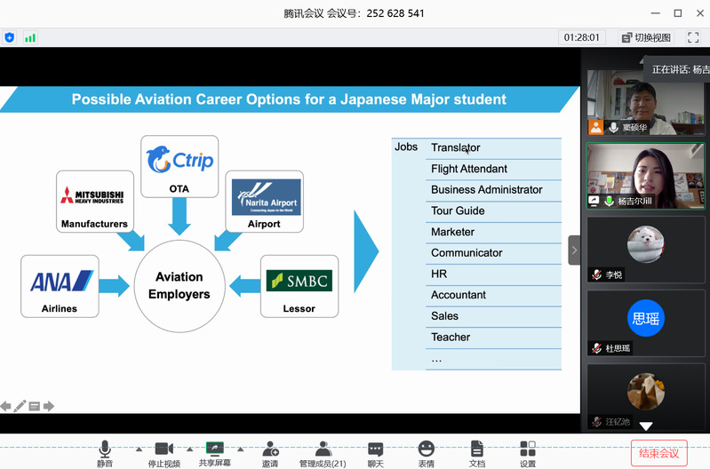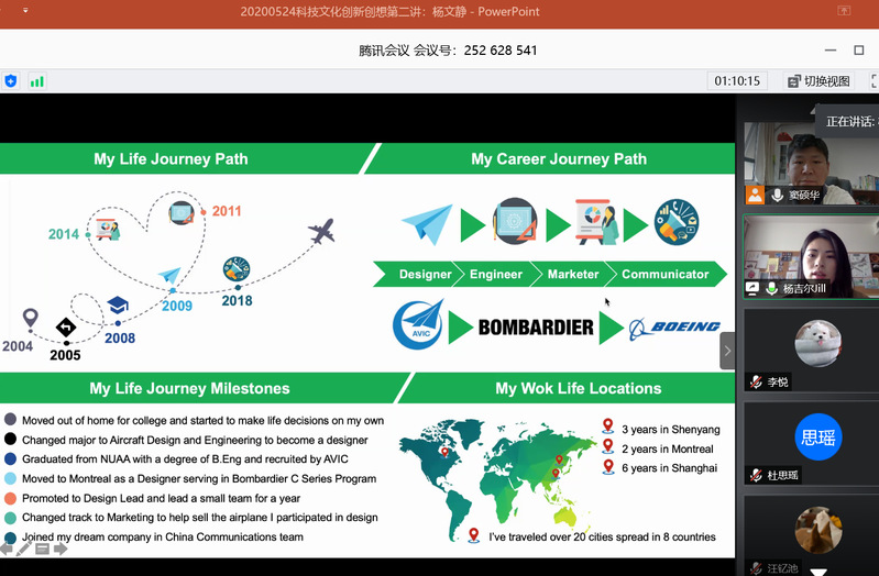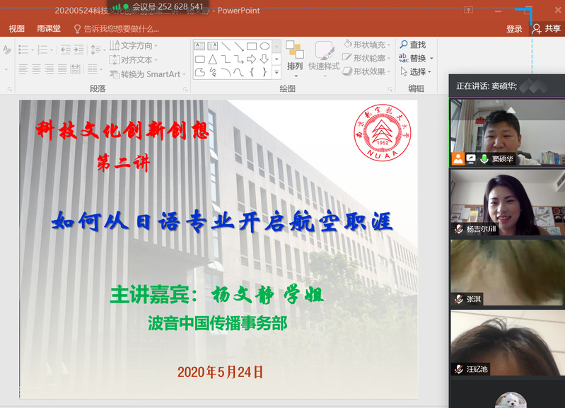 5月24日下午,日语系精品企业课程《科技文化创新创想》第二讲通过腾讯会议模式开启。本次讲座主题为《如何从日语专业开启航空职涯》,主讲人为波音中国传播事务部杨文静。