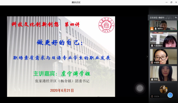 6月21日下午,日语系精品企业课程《科技文化创新创想》第四讲通过腾讯会议模式开启。本次讲座主题为《做更好的自己:职场素质需求与日语专业学生的职业发展》,主讲人为张家港经开区(杨舍镇)团委书记虞宁漪。