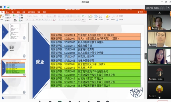 随后,彭欢对“准毕业生”进行就业动员,她为大家展示了学院近六年学生的考研、保研、就业、留学数据和学生地域分布图,详细地展示了不同方向发展的可能性,提醒学生们及时关注招聘信息发布,拓宽信息获取渠道,把握机会;同时对学生居家学习期间的心态表示理解,勉励学生们从个人实际情况出发,准确定位,早做准备,充分把握、合理利用大三暑假的关键时间,实现自己的目标。