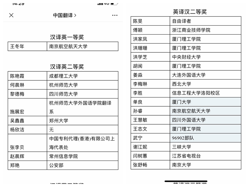 近日,在中国译协《中国翻译》编辑部与四川外国语大学联合举办的第三十二届韩素音国际翻译大赛中,成人漫画 两研究生同学从全球一万八千多名译者中脱颖而出,斩获佳绩。其中,王冬年同学获得汉译英项目唯一的一等奖,孙睿同学获得英译汉项目二等奖,这是成人漫画 学生自参加该赛事以来取得的最高奖项。
