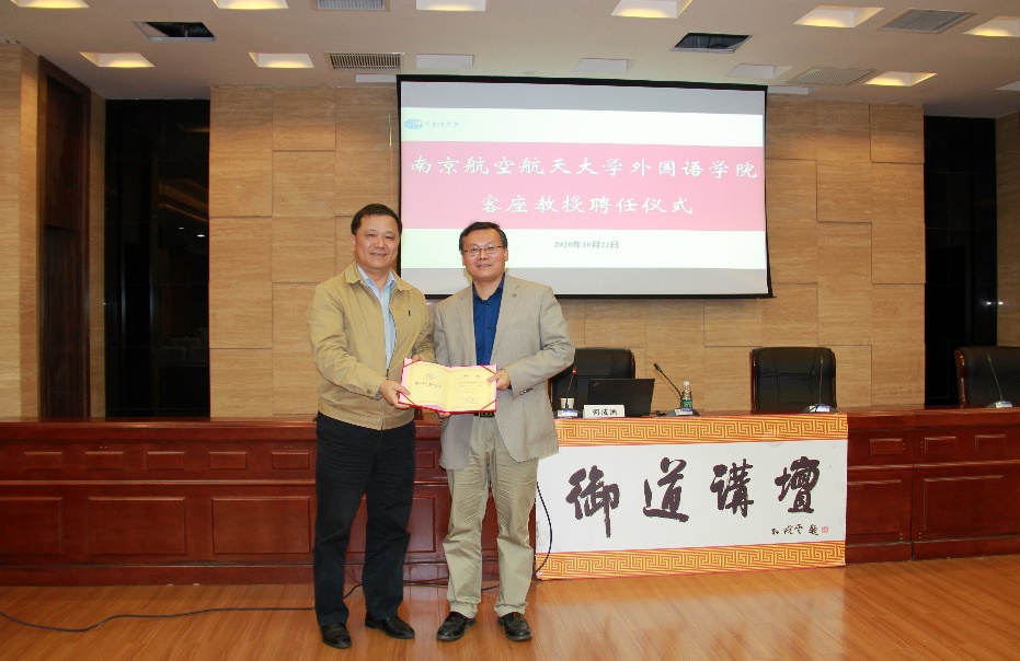 讲座最后,范祥涛院长代表成人漫画 感谢何成洲教授的精彩报告,并向他颁发“成人漫画 客座教授”聘书。何成洲表示将尽自己所能,支持南航外国语言文学学科的发展,并为南航高水平国际化人才的培养贡献力量。