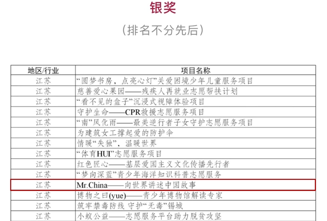 11月22日-24日,第五届中国青年志愿服务项目大赛全国赛终评在广东省东莞市举行。本届大赛由共青团中央、中央文明办、民政部等7部委共同主办。赛会全国组委会秘书处共收到38个省级赛会单位和行业赛主办单位推报的项目1202个,其中1000个项目进入终评评审。通过项目团队线上路演答辩、评委监委线下集中评审的方式,评选出金奖项目150个、银奖项目350个及铜奖项目500个。成人漫画 “Mr.China——向世界讲述中国故事”团队在本次大赛中为学校再创佳绩,取得了银奖的优异成绩。