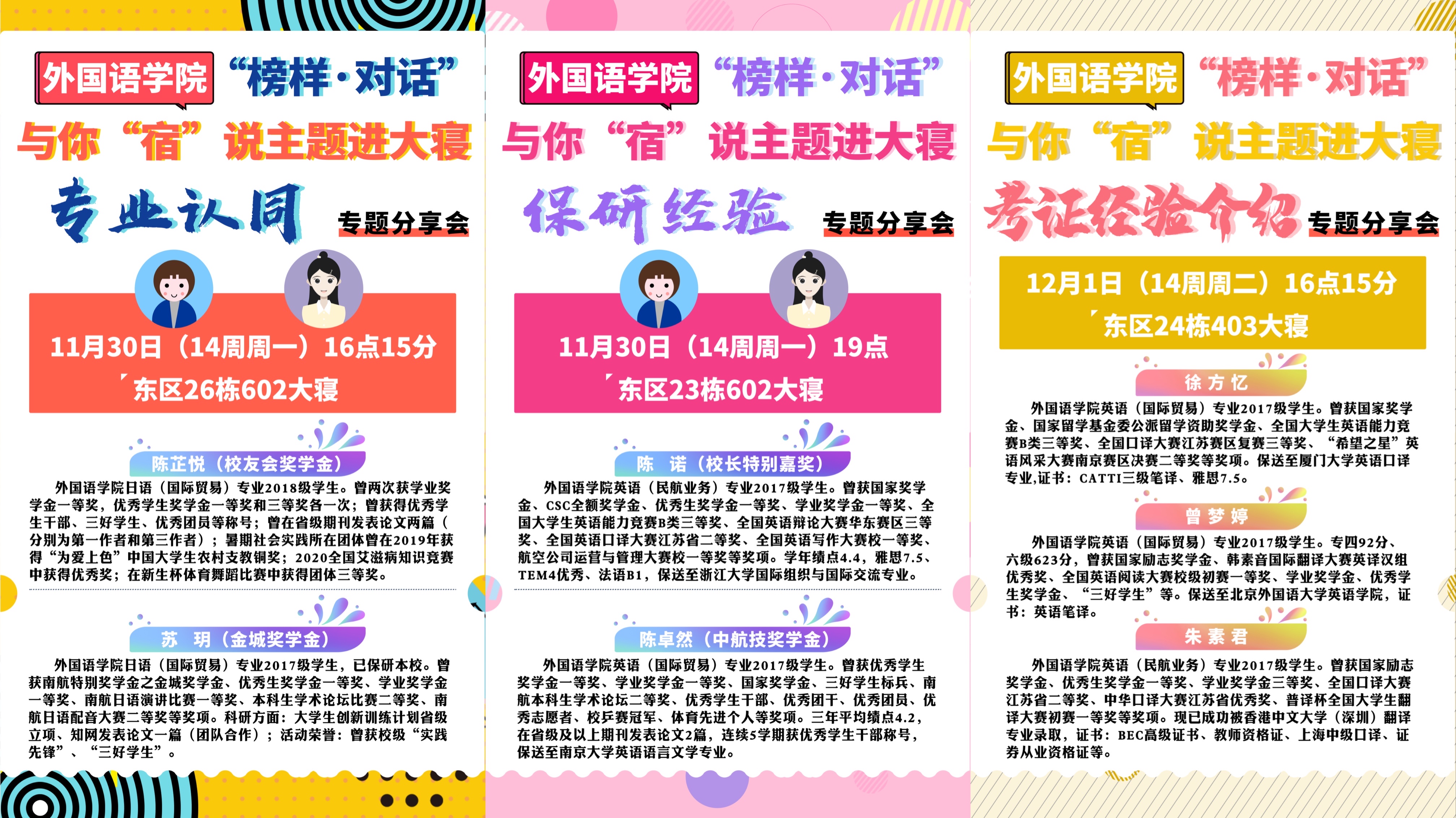为有效解答低年级专业学习和未来选择的困惑,成人漫画 近期开展了3期“榜样·对话” 之与你“宿”说主题进大寝专业学习专题系列分享会。辅导员与高年级优秀学长学姐走进不同宿舍,分别从专业认同、保研经验、考证经验这三个方向与低年级学生们展开深入交流。