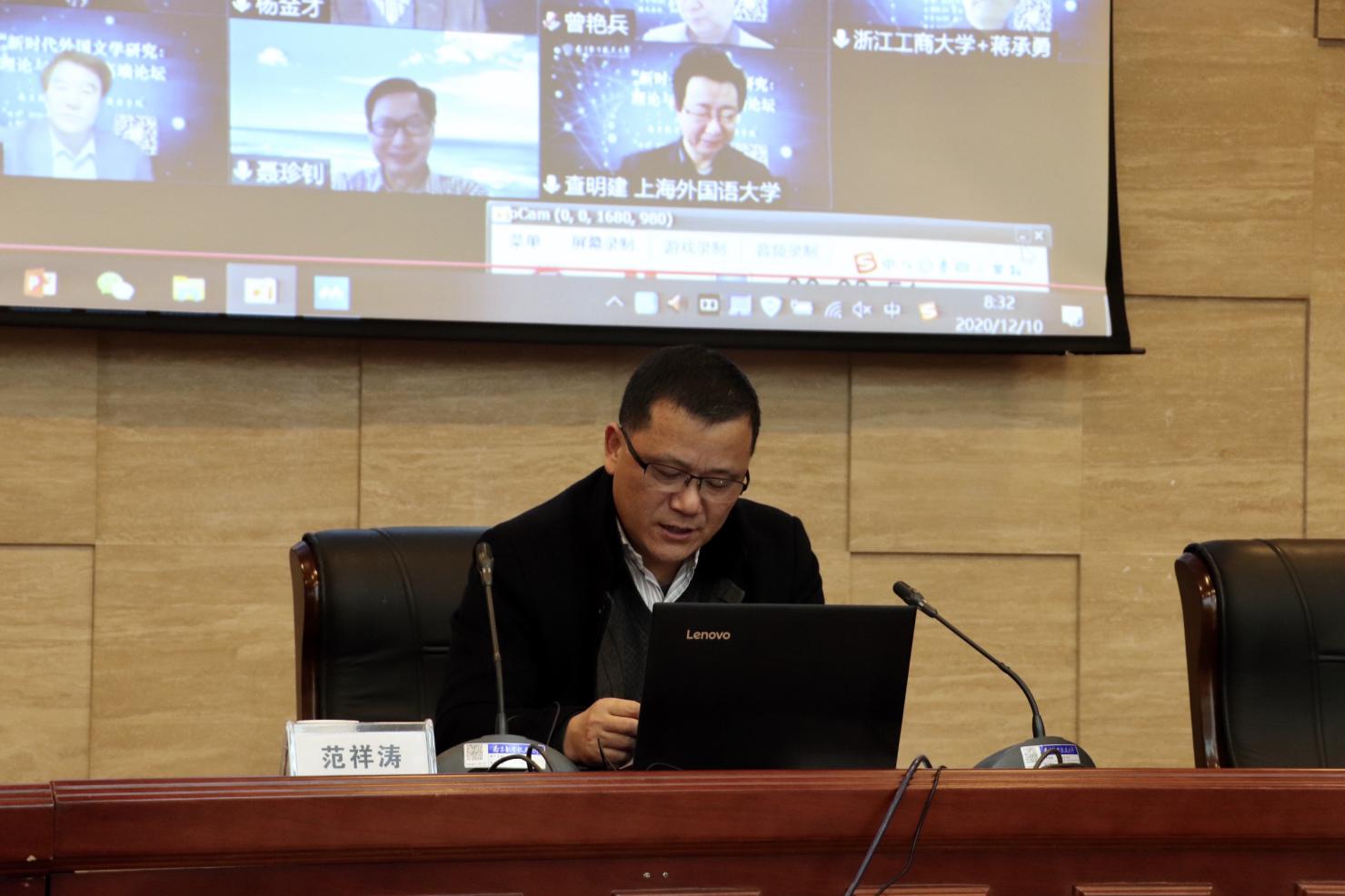 为促进学术交流、助力学科建设,12月10日,成人漫画 举办“新时代外国文学研究:理论与阐释”高端论坛。本次论坛由来自上海外国语大学、浙江大学、南京大学、中国人民大学等高校的知名专家领衔主讲,来自全国的学者及师生400余人通过线上和线下的方式参加了本次论坛。论坛开幕式由成人漫画 院长范祥涛主持,成人漫画 党委常委、副校长宋迎东,全国美国文学研究会副会长、《当代外国文学》主编杨金才教授分别致开幕词。