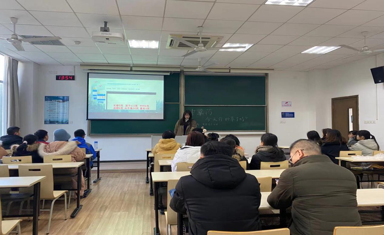 首先,团支部书记鲁梦嘉介绍了新冠肺炎防范的三个药方和莲、冬虫夏草、红花、参、决明子等九味药材的具体功效,阐释了中草药发展历史。