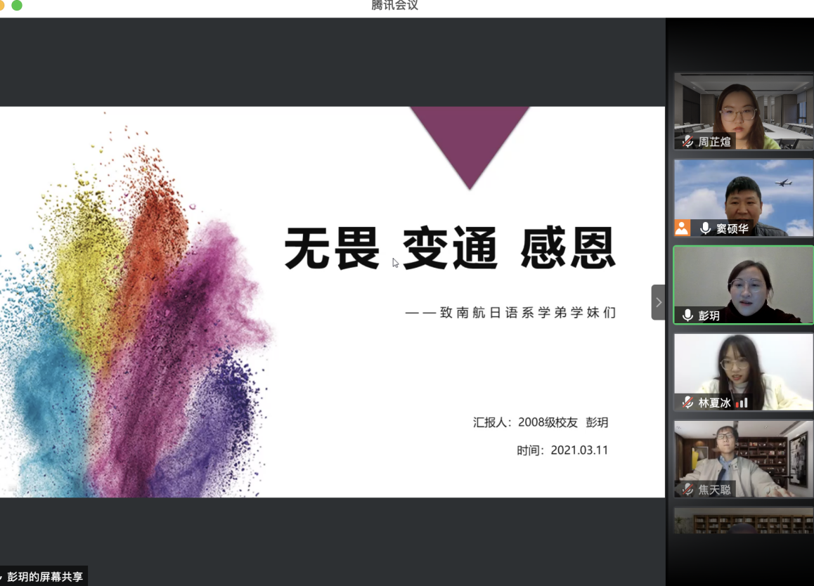 《科技文化创新创想》是成人漫画 日语系设置的精品企业课程,由日语系邀请成功企业人士讲授。2021年第一讲于3月11日以《日语学子职业发展规划——以日资企业为例》为主题,通过腾讯会议模式开启。主讲人为08级校友彭玥,现任永旺(湖北)商业有限公司人事主管。
