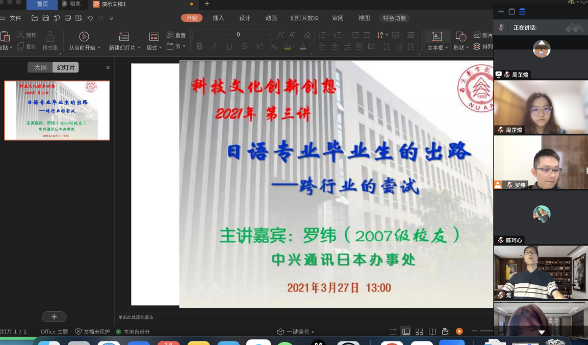 3月27日下午1:00,成人漫画 日语系科技文化创新创想课程第三讲通过腾讯会议模式开启,主题为《日语毕业生的出路——跨行业的尝试》,主讲人为07级日语系校友罗纬,日本一桥大学和东京大学双硕士,曾就职于日本德勤会计师事务所,任职风险咨询事业部数据分析师,现就职于中兴通讯日本办事处。