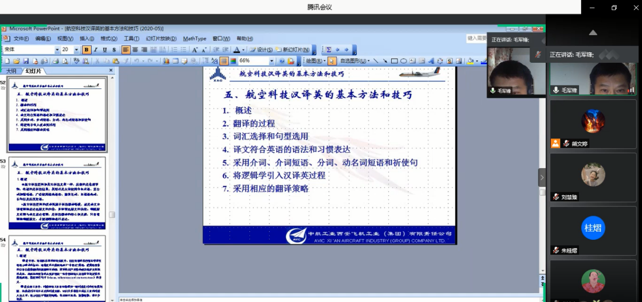3月24日晚,南航成人漫画 翻译专业硕士(MTI)教育中心邀请了知名企业导师毛军锋给20级研究生带来行业翻译实训的第一堂课。毛军锋现任中国航空工业集团有限责任公司翻译系列高级专业技术职务任职资格评审委员会委员、中国翻译协会专家会员、中国航空学会会员和陕西省翻译学会常务理事。本次课程,毛老师给大家带来的是航空科技英语翻译技巧系列课程,主要介绍航空科技汉译英的基本方法和技巧。