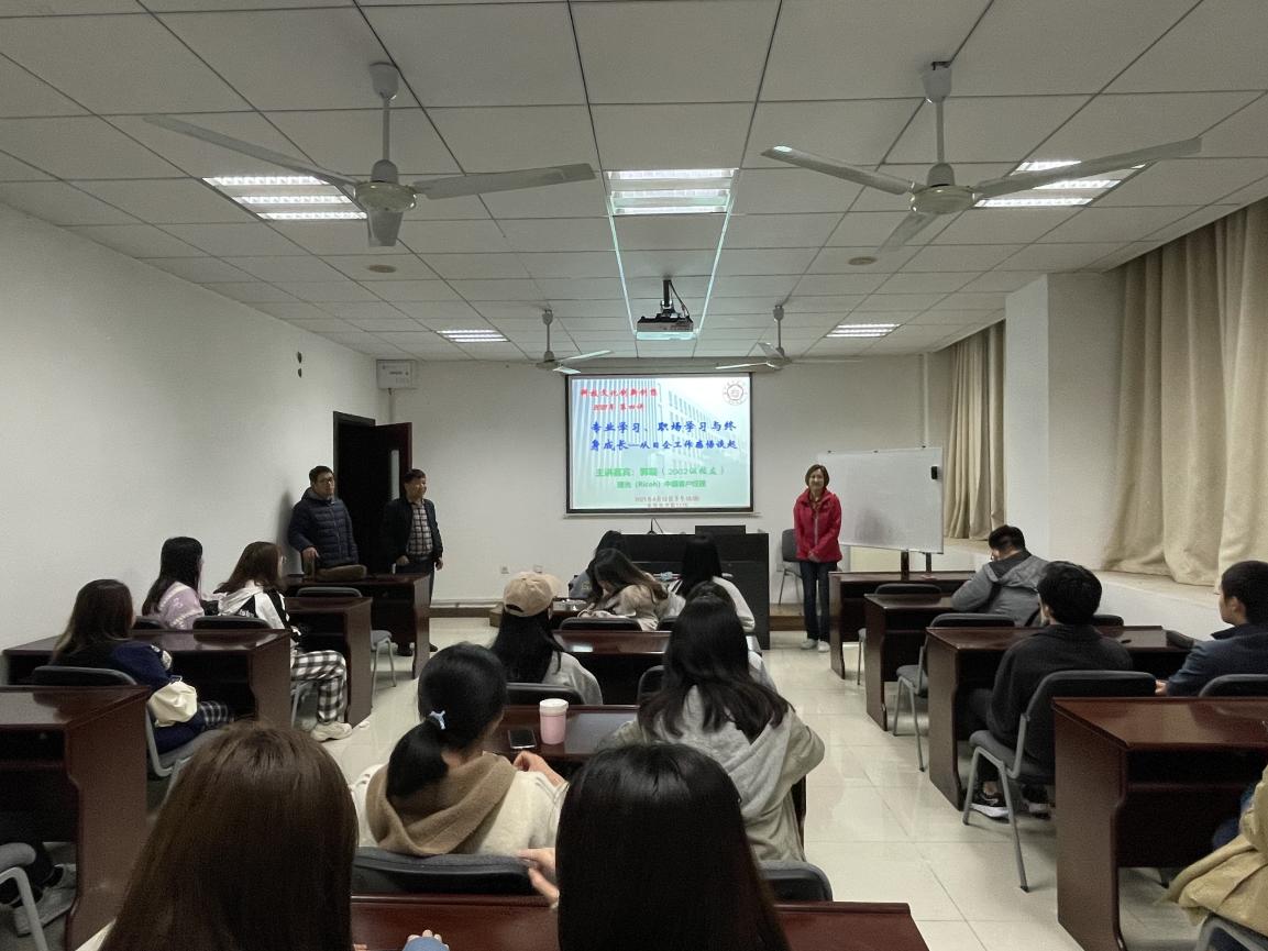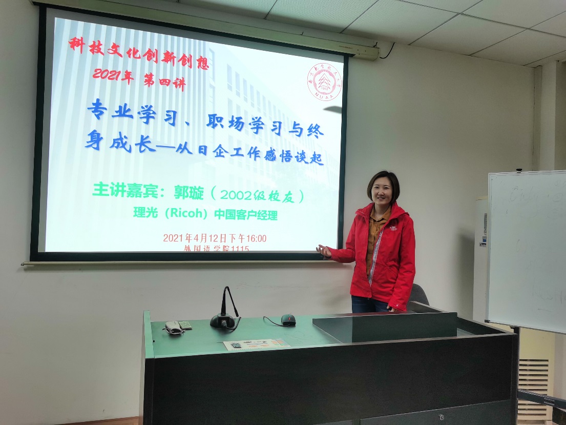 4月12日下午4:00,成人漫画 日语系科技文化创新创新课程第四讲在成人漫画 1115教室成功举办,主题为《专业学习、职场学习与终身成长——从日企工作感悟谈起》。主讲嘉宾为02级日语系校友郭璇,现任理光(Ricoh)中国客户经理。