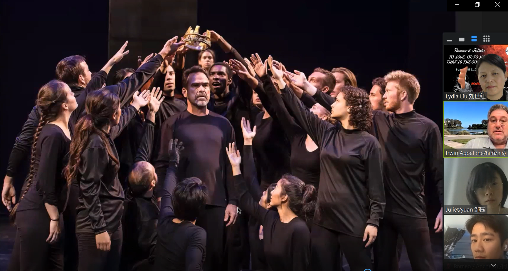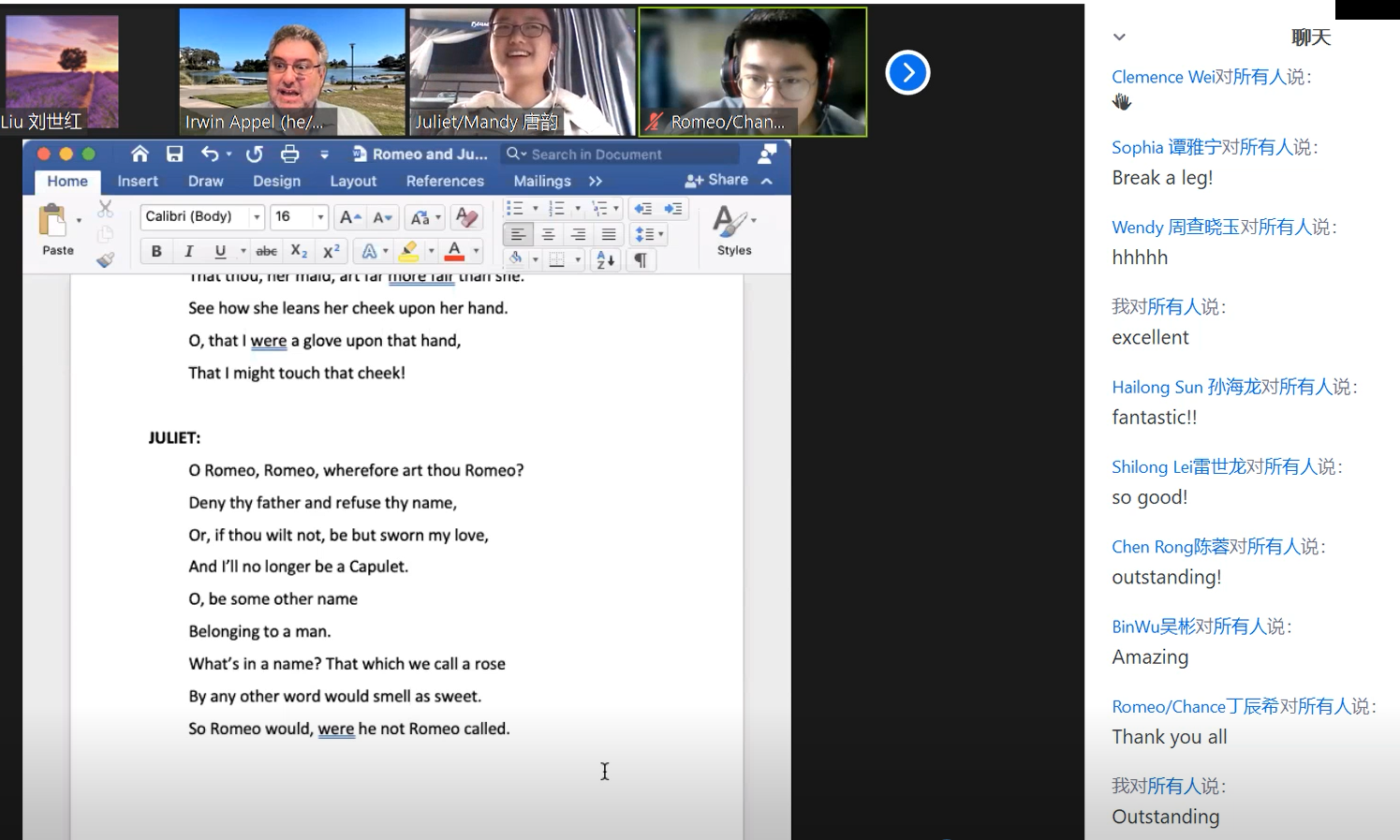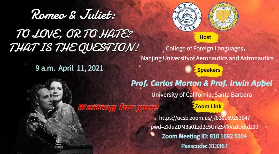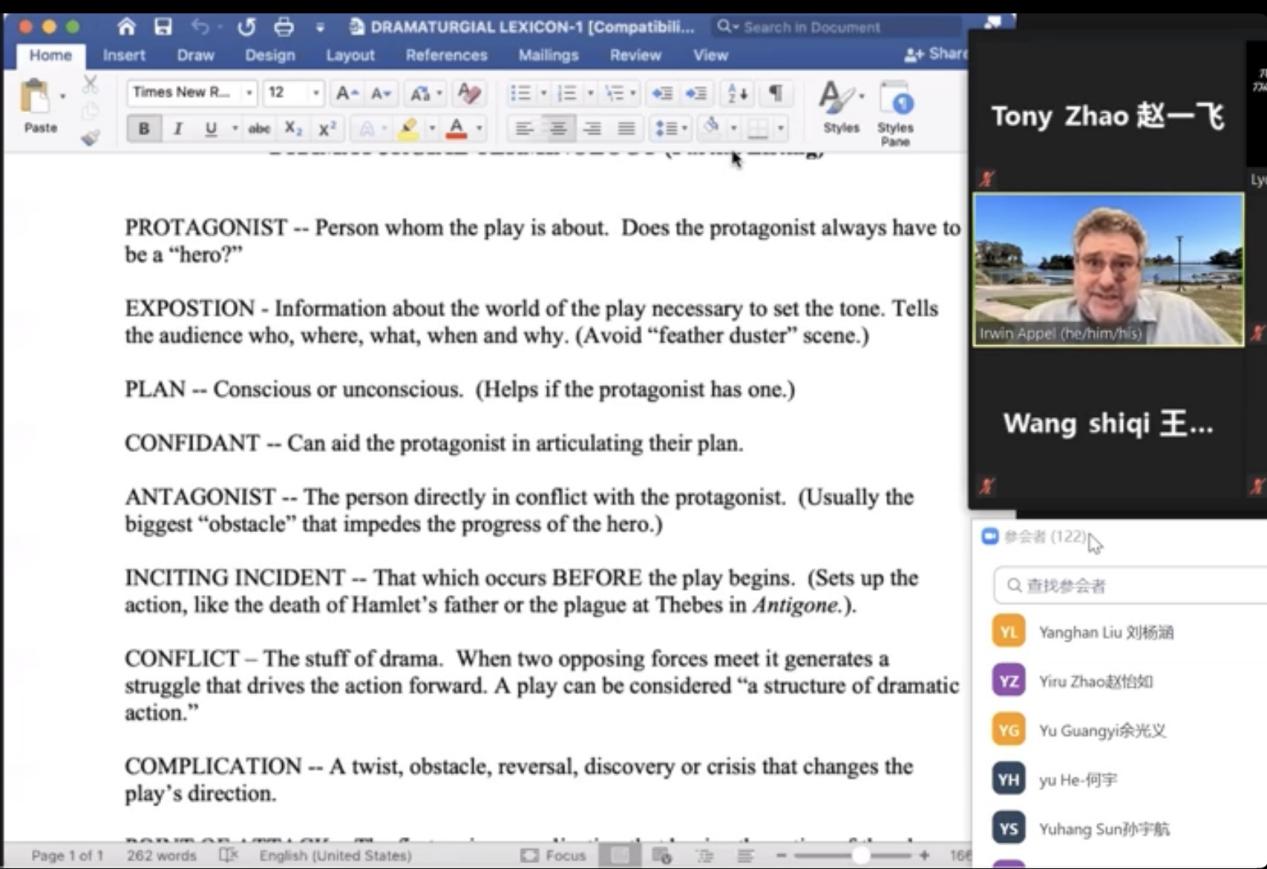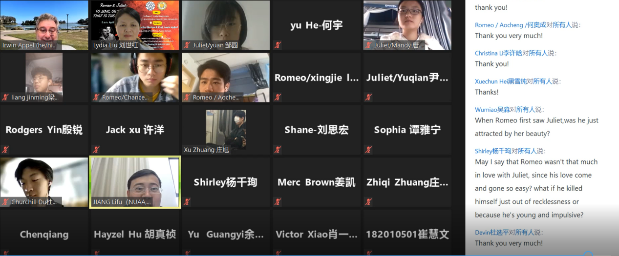本次讲座共分为两个环节,由成人漫画 国际联络中心主任、刘世红副教授主持。在第一环节中,加州大学圣巴巴拉分校戏剧教授Irwin Appel从自己的研究和实践情况出发,和同学们分享了人物角色、人物关系、故事背景、情节设置和台词意义等方面的相关知识。教授还结合《罗密欧与茱丽叶》中的情节介绍了戏剧中的各要素,如主角、情节、反面角色、事件、矛盾冲突、高潮等。随后,教授和同学们针对《罗密欧与茱丽叶》剧情相关的问题进行了热烈讨论,而Irwin Appel教授针对同学们的问题进行了一一解答,向同学们展示了自己的见解。在第二环节中,身为演员的Appel教授通过对比不同背景音乐、变换语气语调,亲自朗诵了《罗密欧与茱丽叶》中的经典台词和独白,并指导同学们对其中的精彩片段进行了演绎和表演。随后,Irwin Appel教授启发同学们围绕莎士比亚戏剧的表达思想以及《罗密欧与茱丽叶》的悲剧内核展开了热烈的讨论,与会的师生们通过会议软件聊天室、或者开麦提问,气氛活跃,互动精彩纷呈。讲座的最后,成人漫画 副院长姜礼福老师对讲座进行了总结,高度评价了Irwin Appel教授讲座的学术价值,并邀请Irwin Appel教授未来到我校开展更多更深入的合作交流。