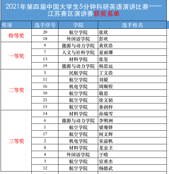 2021年第四届中国大学生5分钟科研英语演讲比赛—江苏赛区演讲赛是基于去年南航学术英语演讲大赛的延伸,活动得到了中国学术英语教学研究会、中国专门用途英语专业委员会、上海高校大学英语教学指导委员会,以及成人漫画 研究生院的大力支持。本次大赛吸引了我校来自20几个不同专业的约700名研究生报名参加初赛,通过第一轮筛选,共118名选手的演讲视频入围复赛。在相关教师指导下,入围选手对参赛作品进一步打磨,在第二轮评审后共推荐46名硕博研究生基于自己或团队的原创科研成果进行了专业的视频录制,并提交了参赛作品。最终经英语老师和专业评委的综合评审,共21名同学晋级现场决赛。