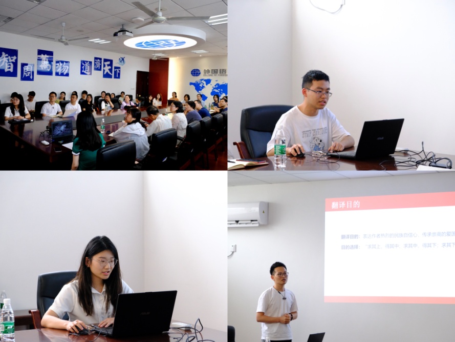 首先3位获奖学生代表进行译文分享。刘研针对句子的重点,分享了翻译的技巧,建议大家借助一些抽象词更地道的翻译;沈金涛表示语言的多样化也是翻译的关注点,比如原文中的“代替”在译文中就有8种不同的呈现;李康康则介绍了本次翻译的翻译目的、翻译原则以及翻译难点。