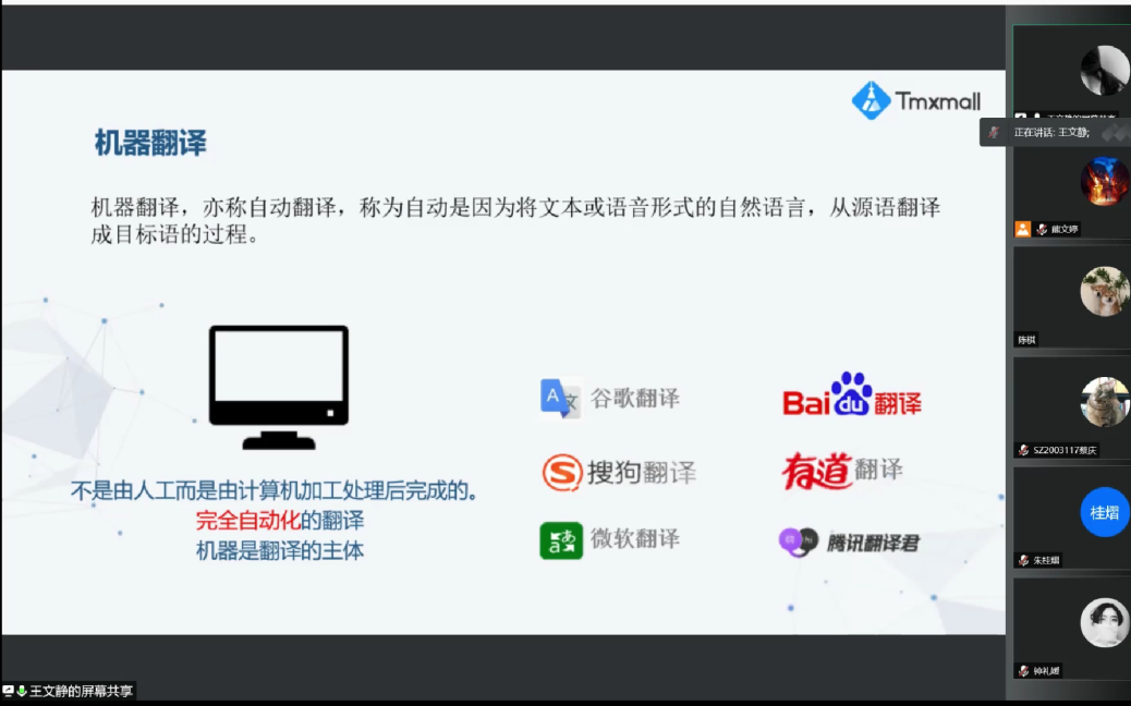 7月8日晚7点,上海一者信息科技有限公司高级运营经理王文静应成人漫画 邀请,为20级MTI研究生带来了一堂精彩的线上讲座。王经理曾参与多个大型特色语料库建设项目,擅长语料库的生产制作及检索分析,并熟悉各类主流计算机辅助翻译工具实践应用,本次她带来的讲座主题为“信息检索与机器翻译译后编辑”。