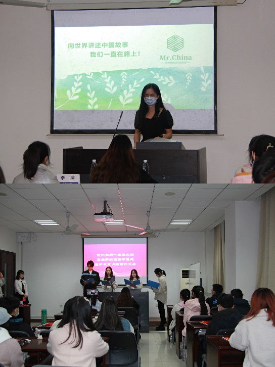 在“颂百年·礼赞篇”首先进行介绍的是Mr.China团队,他们记录中国文明,弘扬传统文化,现场播放了团队实践视频,让同学们感受到了中国精神的魅力。外院联合党支部“初心之地叙党史,时代之音外语说”的实践活动访寻红色故地,传播红色影音,并现场以诗朗诵的形式讲述了他们的实践故事,带领同学们汲取党史的磅礴力量。