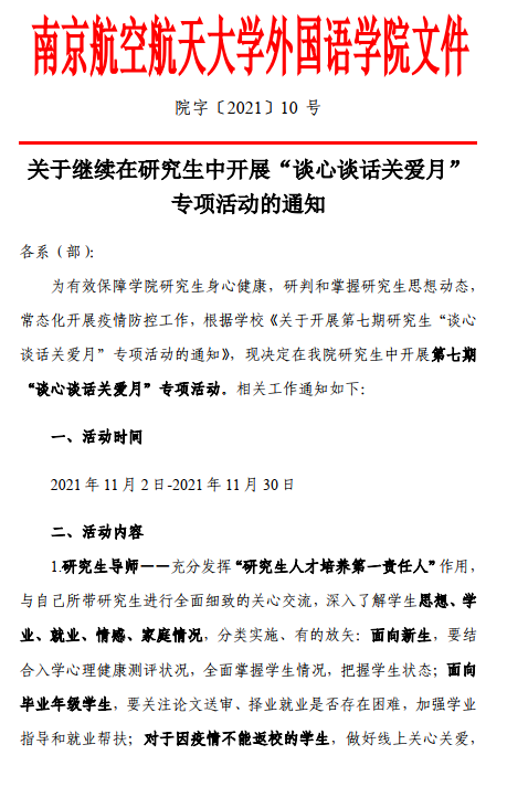 学院领导高度重视此次专项活动,院党委会专题研究讨论了学生心理健康教育工作,院党政联席会讨论出台了《关于继续在研究生中开展“谈心谈话关爱月”专项活动的通知》,分别明确院领导、研究生导师、研究生辅导员以及各系(部)在推动学生健康发展过程中的责任与要求,分层分类开展工作,全员参与、全面覆盖。同时坚持以人为本,发挥宿舍、年级心理气象员在学生心理健康教育中的积极作用,联合研究生会增设“心灵信箱”纾解学生情绪。