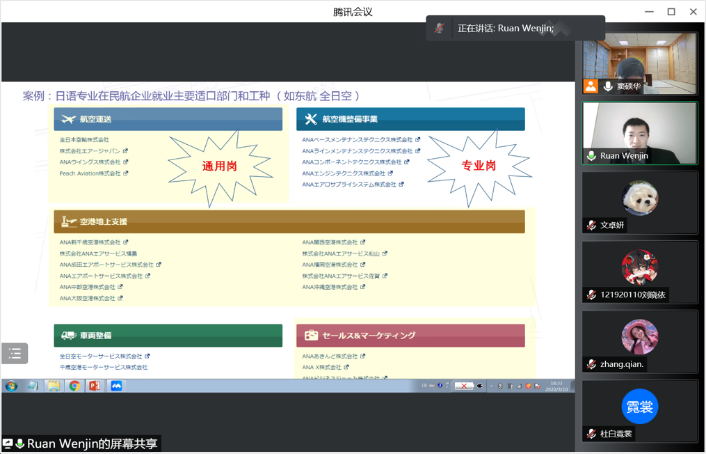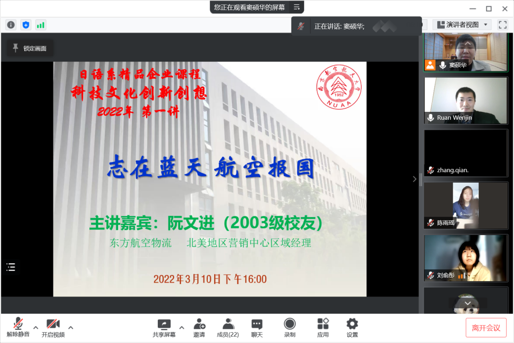 3月10日下午4:00,成人漫画 日语系科技文化创新创想课程2022年度第一讲通过腾讯会议成功进行,主题为《志在蓝天,航空报国》。主讲嘉宾为03级日语系校友阮文进,现任东方航空物流北美地区营销中心区域经理。