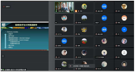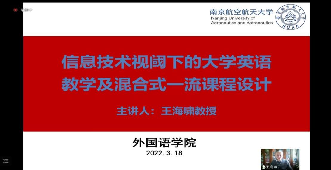 3月18日下午,成人漫画 邀请教育部高等学校大学外语教学指导委员会委员、南京大学教授王海啸教授做题为“信息技术视阈下的大学英语教学及混合式一流课程设计”的线上讲座,讲座由成人漫画 副院长徐以中主持,院长范祥涛、成人漫画 教师及来自全校其他各学院的60多位老师全程参加了讲座。