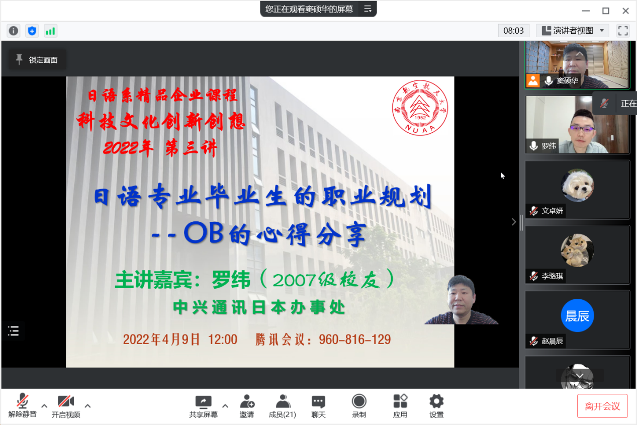 日语系科技文化创新创想课程第三讲通过腾讯会议成功进行。本次讲座的主题为《日语专业毕业生的职业规划——OB的心得分享》,主讲人为07级日语系校友罗纬,获日本一桥大学和东京大学双硕士,曾就职于日本德勤会计师事务所,任职风险咨询事业部数据分析师,现就职于中兴通讯日本办事处。