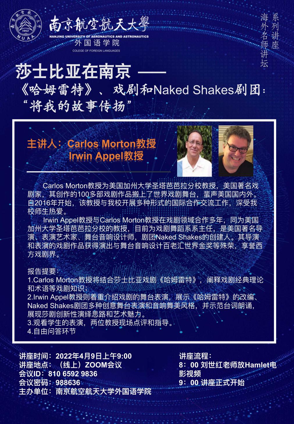 4月9日上午,学院邀请美国加州大学圣芭芭拉分校Carlos Morton教授和Irwin Appel 教授,开展了题为“莎士比亚在南京” 之“《哈姆雷特》、戏剧和Naked Shakes剧团:‘将我的故事传扬’”的线上讲座。我校及南京农业大学等共计100多名师生参加。