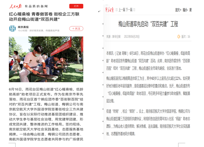 6月16日,成人漫画 师生赴南京雨花区梅山街道开展“双百共建”活动,梅山街道党工委书记陈志新、办事处主任李文浩、党工委副书记杨镇宁,梅钢公司统战部部长苏潜、团委书记徐立立,成人漫画 党委书记左彤云、校团委副书记赵铮、学院党委副书记梁薇参加了此次活动。活动得到了人民日报平台、新华日报、南京晨报的宣传报道。