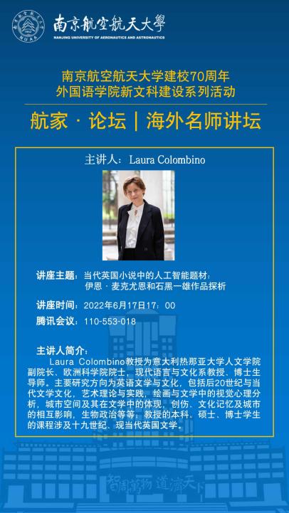 Laura Colombino教授为欧洲科学院院士、意大利热那亚大学人文学院副院长,现代语言与文化系教授、博士生导师。主要研究方向为英语文学与文化,包括后20世纪与当代文学文化,艺术理论与实践,绘画与文学中的视觉心理分析,城市空间及其在文学中的体现,创伤、文化记忆及城市的相互影响,生物政治等等;教授的本科、硕士、博士学生的课程涉及十九世纪、现当代英国文学。