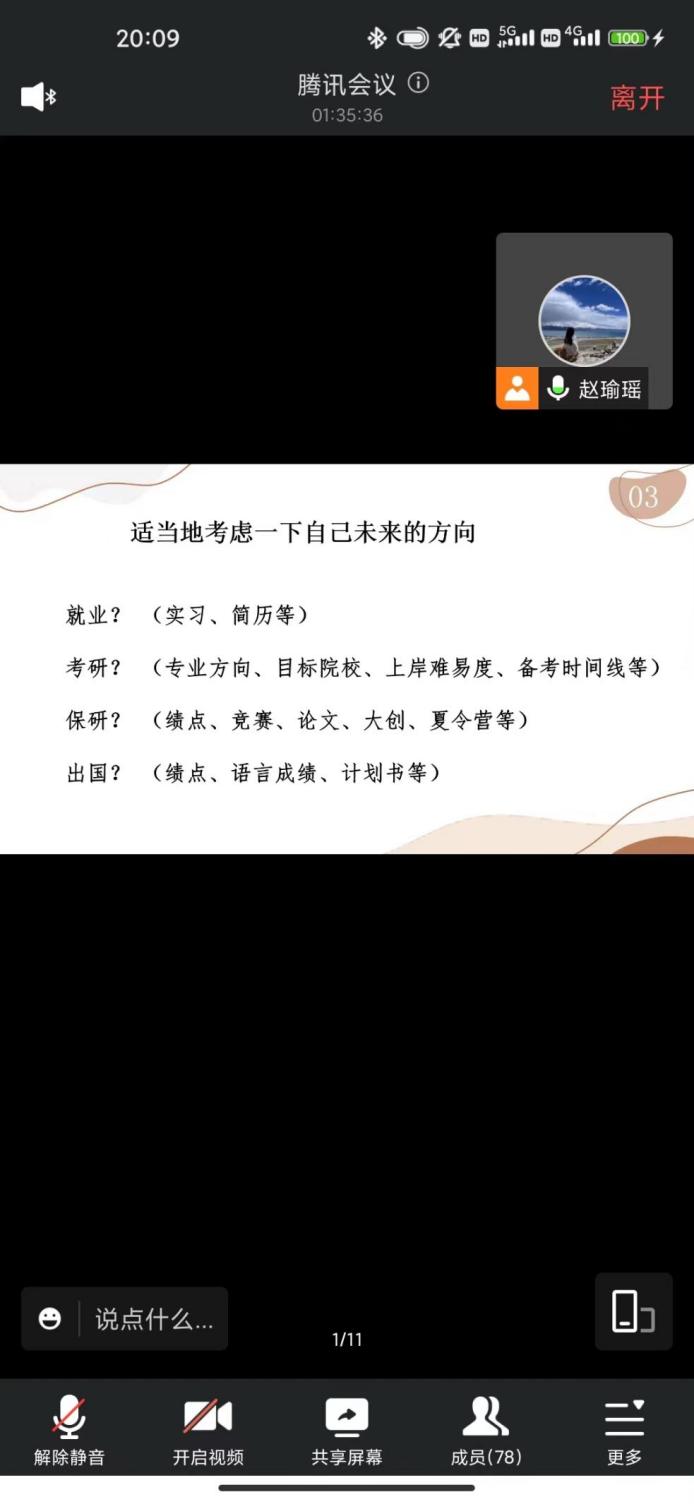 会议伊始,学院2019级本科生王逸杰、魏嘉、文卓妍围绕保研,进行了经验分享。王逸杰从保研的前期准备到保研的整个过程进行了详细的讲解,希望学弟学妹们不忘初心,保持热爱;魏嘉通过路径选择等多个方面,引导学弟学妹们提前思考自己的未来规划,找到适合自己的方向;文卓妍详细介绍了保研流程,希望学弟学妹在口语练习方面,提前进行有针对的练习。