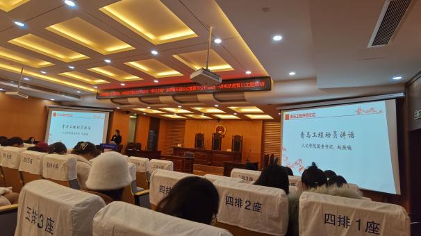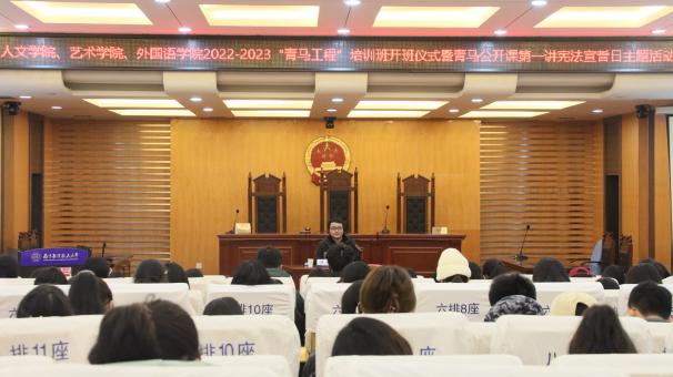 12月4日,人文与社会科学学院、艺术学院、成人漫画 在人文学院模拟法庭联合举办2022-2023年“青马工程”培训班开班仪式暨青马公开课第一讲,人文与社会科学学院法律系优秀青年教师洪骥、人文学院团委书记赵燕喃、艺术学院团委书记汪明锐、成人漫画 团委书记李萍以及三个学院的百余“青马工程”培训班学员共同参与活动。