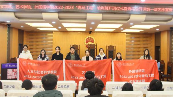 在开班仪式上,赵燕喃进行了动员讲话,指出“青马工程”的开展,归根结底就是要为党培养青年人才,培养具有忠诚的政治品格、浓厚的家国情怀、扎实的理论功底、突出的能力素质的人。随后,三个学院的团委书记分别为各学院青马工程临时团支部授旗。