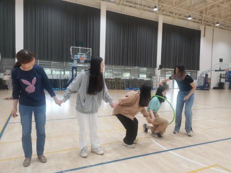 “智传呼啦圈”项目比拼时,每队师生手拉手站成一排,呼啦圈依次循环传递,直至全组完成,期间手不能松开,用时最短的队伍获得胜利。小小的呼啦圈,调动了全体师生的运动细胞,选手们在运动中逐渐热情高涨。