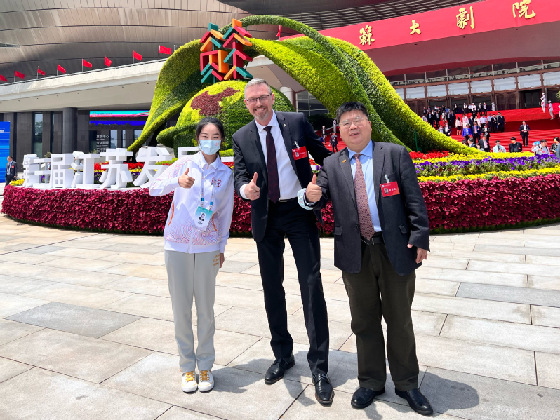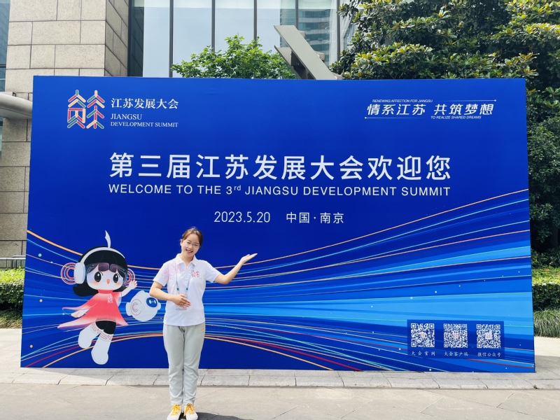 情系江苏,共筑梦想,非常荣幸能够加入到江苏发展大会的志愿服务工作中来。在前期的培训中,我们认真学习与演练各类礼仪与应急知识;在实际志愿服务工作中,我与同学们共同协作,帮助工作人员及到场嘉宾完成相关报到工作。我也非常幸运能够在实际志愿服务工作中,发挥专业特长,完成了一对一的外宾陪同翻译工作,提升我的专业实践能力。在未来,我也会继续努力,为“强富美高”新江苏现代化建设贡献自己的青春力量!