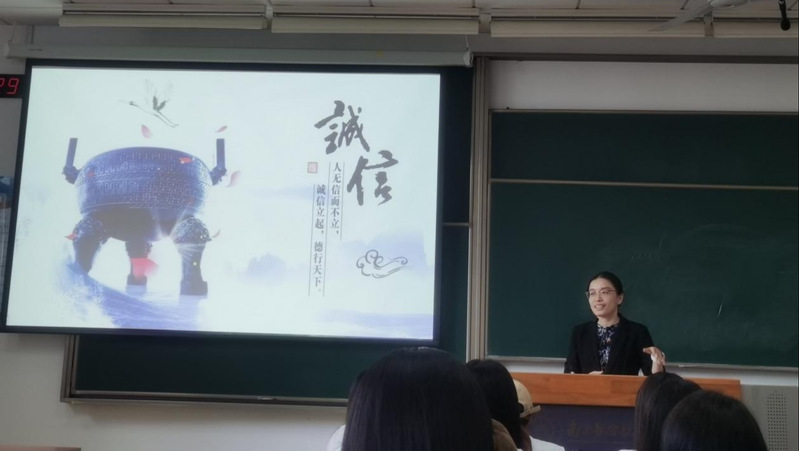 本次团课在团支书陆仪的组织和主持下,对中华民族历史长河中一以贯之的诚信美德进行了探索和学习。首先,团支书为大家深入阐释了诚信的概念,由古及今,深刻把握新时代讲诚信的历史、价值、实践逻辑,从理论联系实际。在为大家讲述新时代诚信内容时,陆仪列举了商业、学术、职场中的失信行为的反例,警醒大家为人诚信,尤其是明确当代大学生的自我要求,杜绝学术不端、考试作弊等不诚信行为。