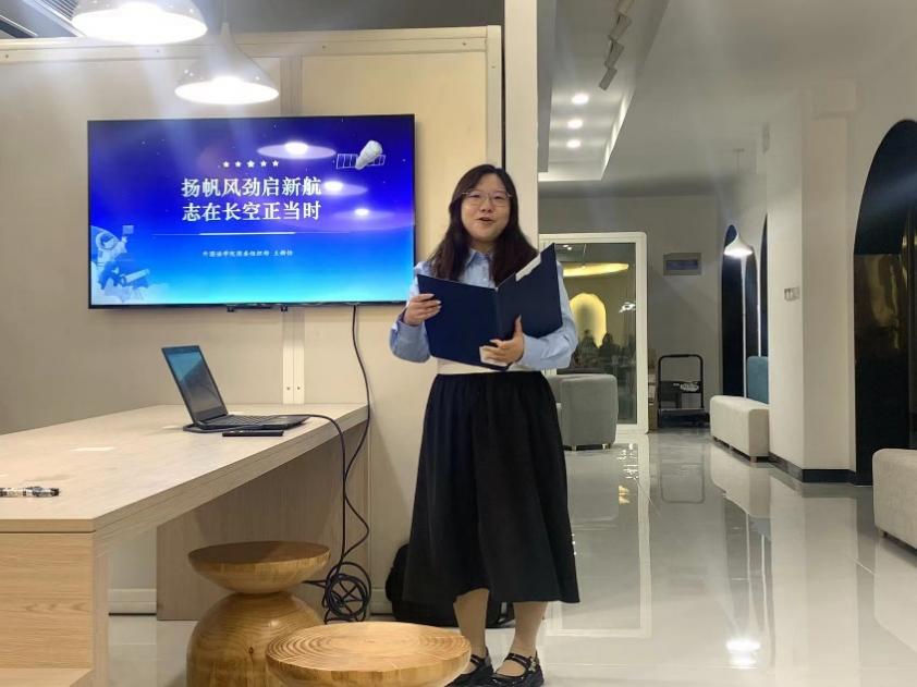 随后,王新怡同学作了题为《扬帆风劲启新航,志在长空正当时》的团课分享。她带同学们重温神州十七号载人飞船发射全过程,并领学了习近平总书记关于航空航天事业的重要讲话精神,并介绍了我校多名杰出校友吴光辉、吴希明、孙泽洲等为祖国航空航天事业作出的巨大贡献,用案例生动诠释了“两弹一星”精神和“载人航天”精神的伟大意义,并鼓励同学们“选择了南航,就是与祖国同行、与时代共进”。