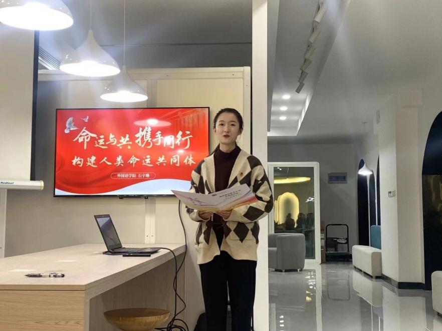 大二团支书石宇琳首先以《命运与共,携手同行——共建人类命运共同体》为题的团课分享。她以一段“卫星眼中人类命运共同体”的小视频引入主题,深入阐述了全球人类命运紧密相连、休戚与共的共同体观念。她从人类命运共同体的四个内涵——国际权利观、共同利益观、可持续发展观和全球治理观的角度分别举例,深入浅出的讲解,使参会同学对人类命运共同体有了更深刻的理解。随后,石宇琳同学联系成人漫画 的“Mr.China”实践团队以及模拟联合国项目,提出了自己对外语青年在了解参与国际事务、推动人类命运共同体中应当发挥积极作用的观点。