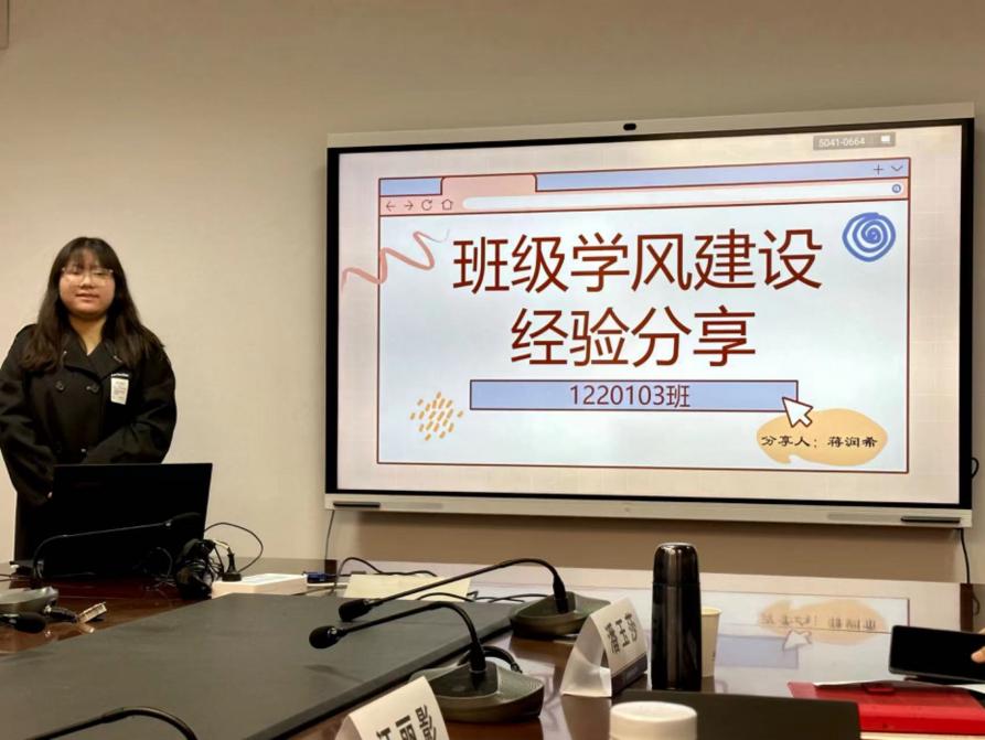 学海同舟标兵班级1222103班的学习委员蒋润希分享了班级学风建设经验,带我们回顾了过去一年班级组织的日常学习打卡与特色学风建设活动。她提到,课余时间的学风建设活动并不是负担,而是增强班内同学学习积极性、主动性的优质平台。她与我们分享了策划班级配音展演、辩论比赛等活动的经验,鼓励所有班级的学习委员们带头建设全班“人人向学、天天进步”的良好学风。