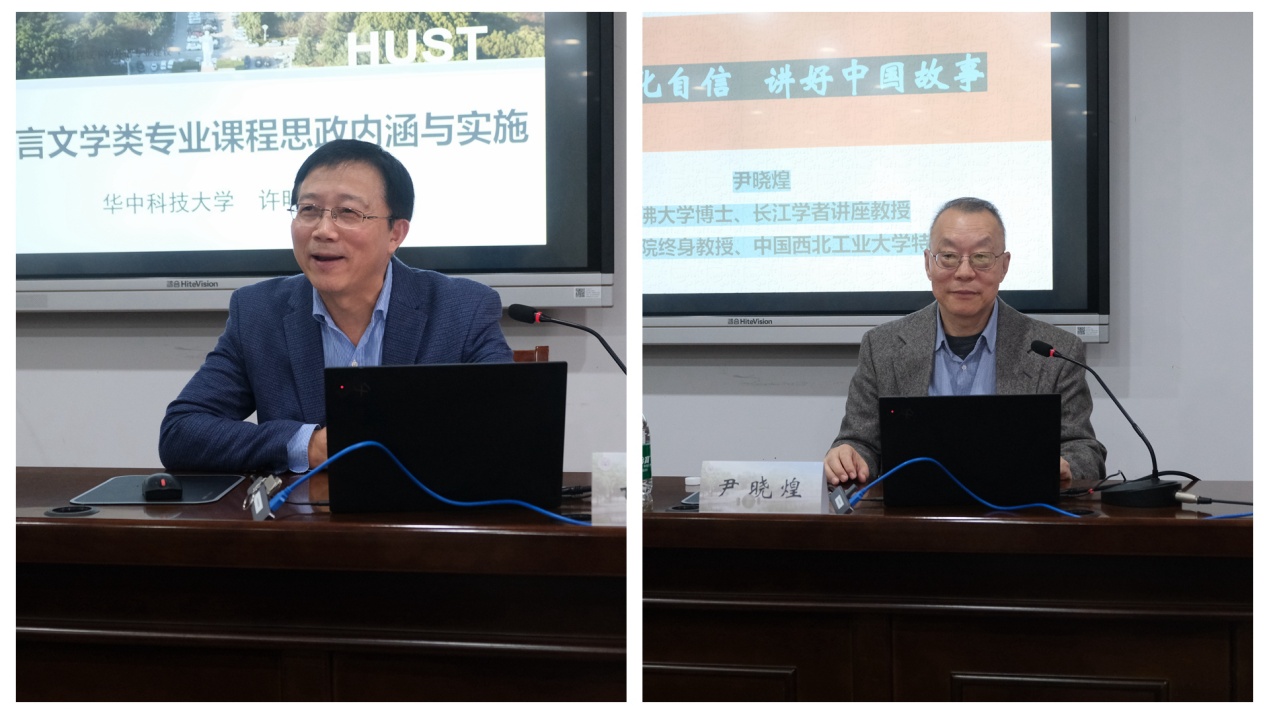 揭牌仪式之后,联盟邀请了华中科技大学成人漫画 院长许明武教授,长江学者讲座教授、西北工业大学成人漫画 博导尹晓煌教授带来了外语课程思政学术报告。线上线下150余人参加了此次报告会。