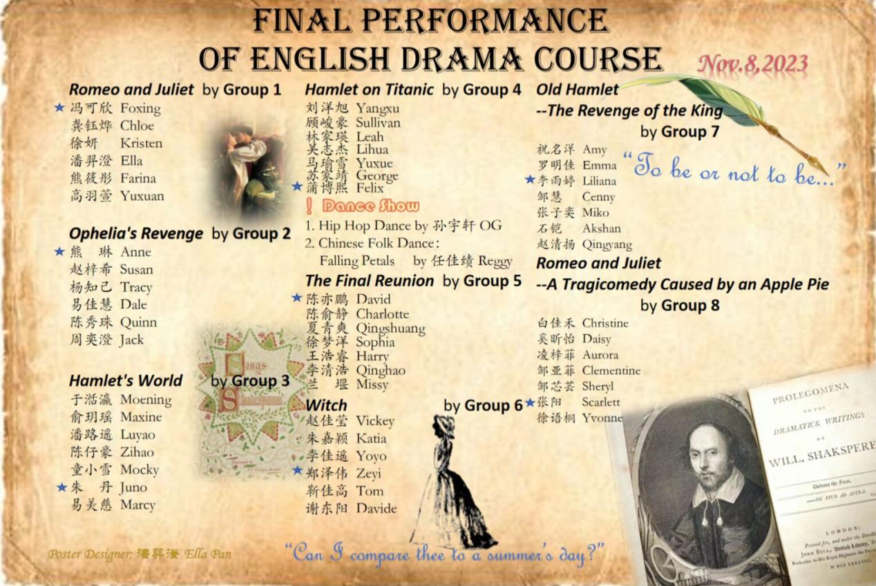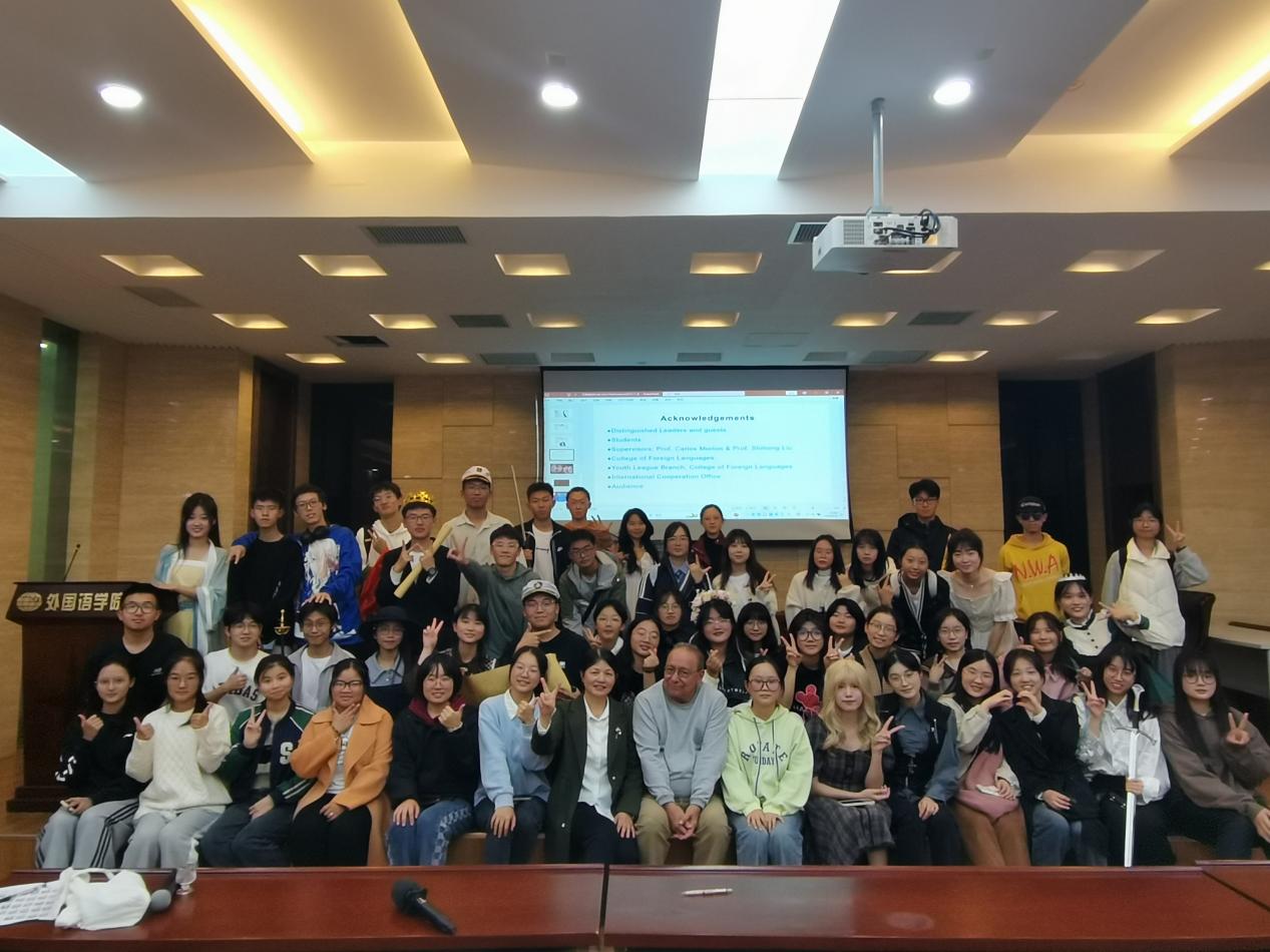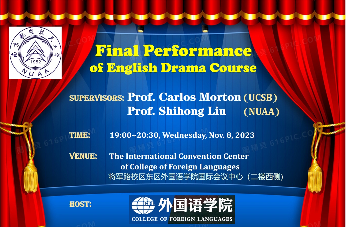 2023年11月8日晚,成人漫画 在国际会议中心成功举办了校通识课《英语戏剧》课程汇报演出。该课程由美国著名戏剧家、加州大学卡洛斯·莫顿(Carlos Morton)教授和成人漫画 副教授刘世红联合授课。通过该课程,学生系统学习了戏剧的发展史和理论知识,重点分析研究了英国最伟大的戏剧家莎士比亚的四部经典戏剧、并进行模仿和改编,最后将自己的改编作品搬上舞台。