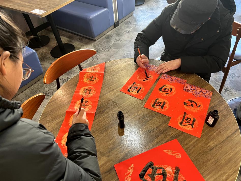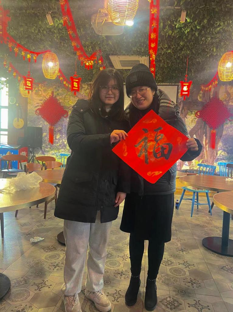 随后,王孝存老师与同学们共同创作春联。为鼓励同学们在学院优良学风建设平台上勇攀学习高峰,师生共同写下寓意深刻的春联——“攀登必胜展宏图,同舟共进御长风”,象征着师生同心同向同行,承载了老师对同学们学习与生活更上一层楼的祝福。