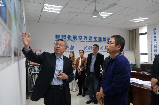 杭育新书记一行首先参观了成人漫画 神经认知语言学实验室,数智化航空外语主题创新区及“耘天坊”国际文化传播发展研究大学生主题创新区,听取了相关负责人的介绍,详细了解实验室及主题创新区在学科研究、人才培养、校企合作等方面的教育教学工作和成果。