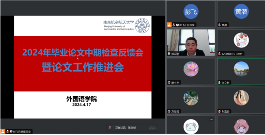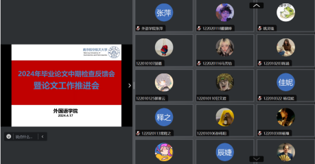 4月17日下午,成人漫画 组织在线召开2024届本科毕业论文中期检查反馈会暨论文工作推进会。学院领导、中期检查工作组督导、英、日语系主任、教学办主任、论文指导老师和全体毕业生共100多名师生参加了会议,徐以中副院长主持会议。