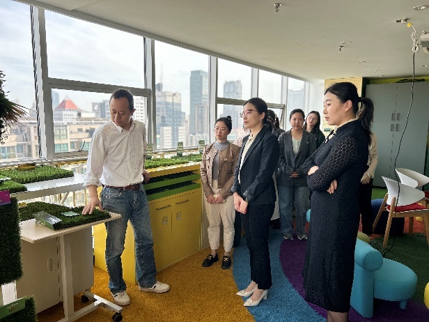 会前,汪锐总监带领南航师生们参观共创草坪“百草集”产品展示间,介绍了不同国家客户对人造草坪的偏好和需求,并耐心的针对同学们的提问进行逐一解答,让南航学子感受到公司为创造更好的运动和景观环境所进行的持续创新。