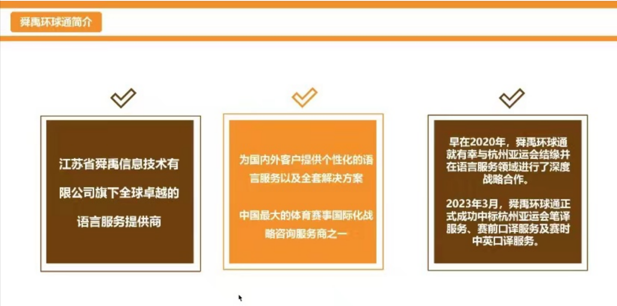 2024年5月20日晚,南航成人漫画 MTI教育中心邀请了江苏舜禹信息技术有限公司市场运营与口译服务部主管彭蕴博给同学们带来了“基于公示语翻译项目的MTI学生实践能力培养”讲座第二讲。彭经理以杭州亚运会为线索展开,展示了优质语言服务如何助力亚运盛会的成功举办。